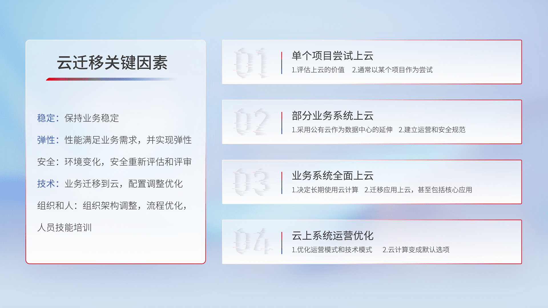 结合实际业务,,,从规划设计、、云平台选型、、、、云原生改造、、、、数据迁移、、、、集成交付,,,迁移全过程为客户识别最佳上云路径,,做好风险识别管理,,设计网络架构、、、、身份权限、、、、安全审计合规、、、操作审计、、日志审计、、、、监控告警策略、、多站点容灾设计等,,,对云上基础设施进行整体规划,,,提升IT治理水平,,,,以满足弹性、、高可用、、、、高性能的需求。。