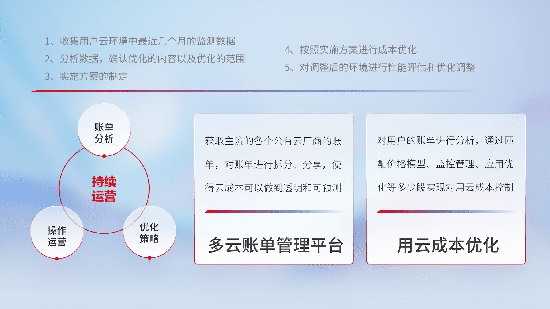 通过多云纳管,,,以统一的资源数据模型把客户的云资源进行抽象和封装,,进而实现对多云资源的统一操作,,,,保障云资源管理的可靠性、、稳定性与可用性。。。量身定制化运维内容,,配置、、、、开发运维、、补丁管理、、、、备份、、、监控、、认证和访问管理、、、、审计和日常巡检等,,,保障在用云过程中的可靠度,,,,稳定度以及高可用率。。。。